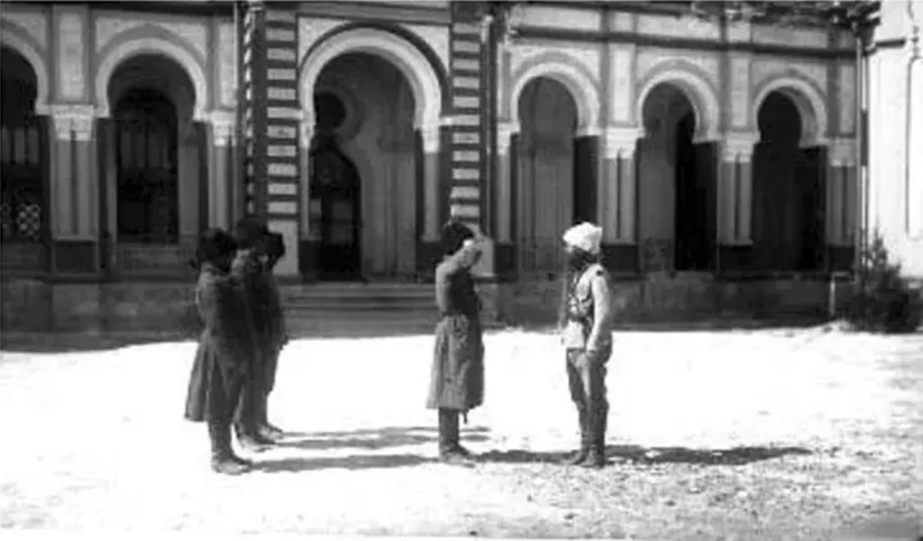 Bukhara sarbazes in front of the palace in New Bukhara