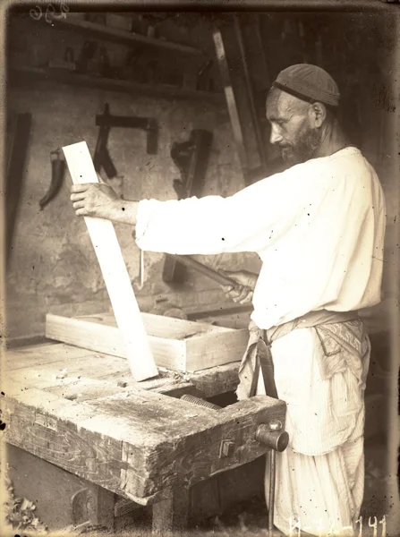 Handicraft carpentry workshop in old Samarkand. Carpenter at work