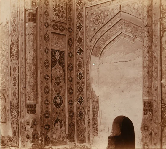 In the passage of the dead above the tomb on the left side. Samarkand. (Fragment of the Tuman-akа Mausoleum portal. Shahi-Zinda.)