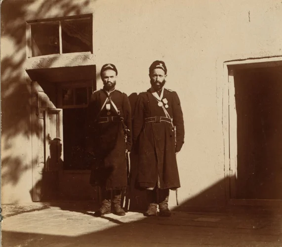 На снимке нукера (полицейские) – низшие должностные лица полиции, подчиняющиеся есаулу, который в свою очередь является помощником есаул-баши (полицеймейстера). Нукерам жалованья не полагалось, жили они за счет населения и освобождались от уплаты податей с участка земли, который может быть обработан двумя волами.