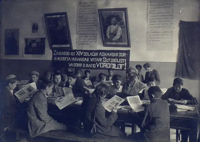 Учащиеся за просмотром газет в клубе Таджикского педагогического техникума в Ташкенте.