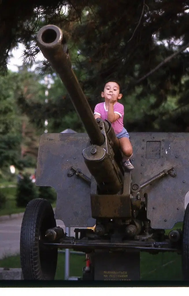 Olmaota. Bolalar yodgorlik yonida gaubitsada o'ynashmoqda